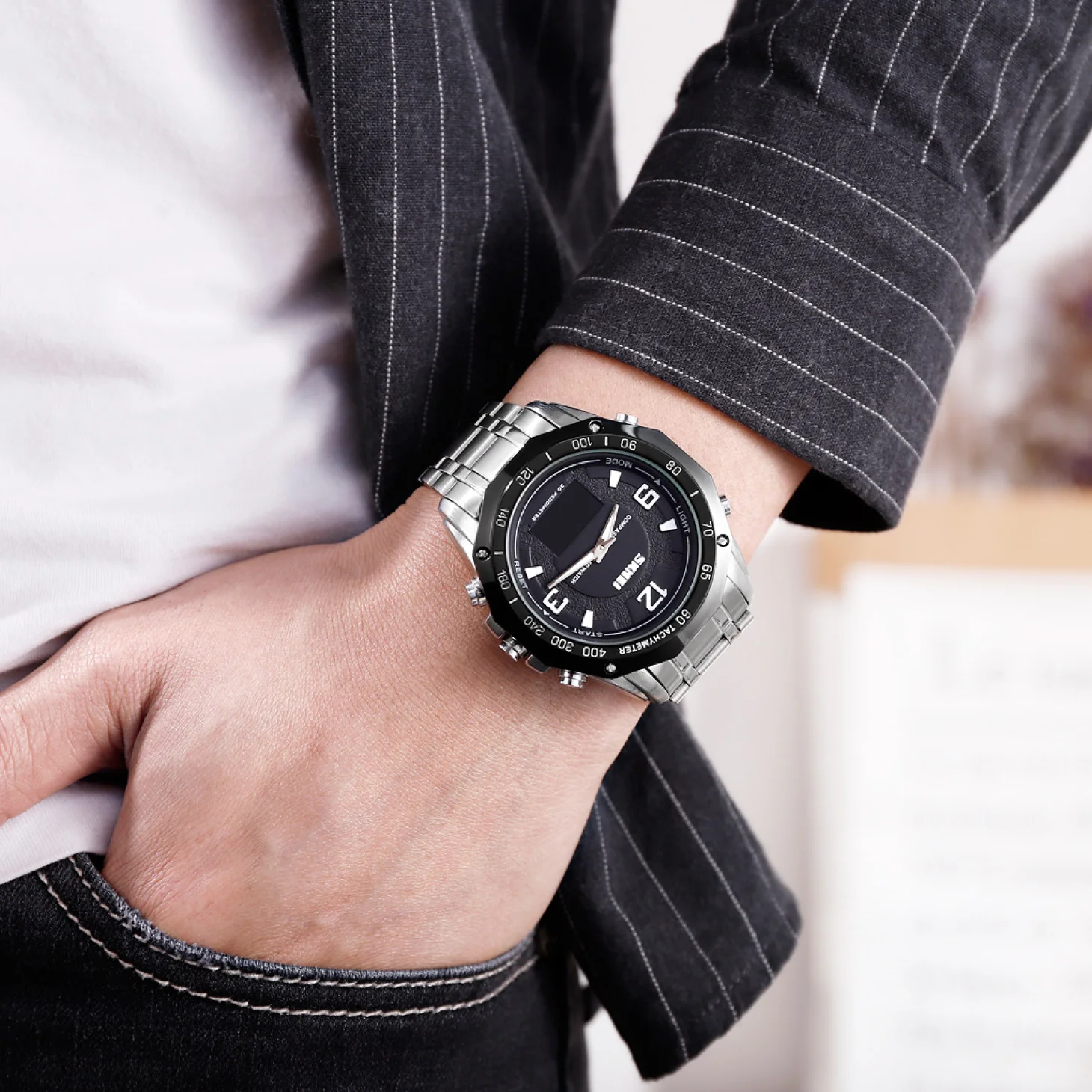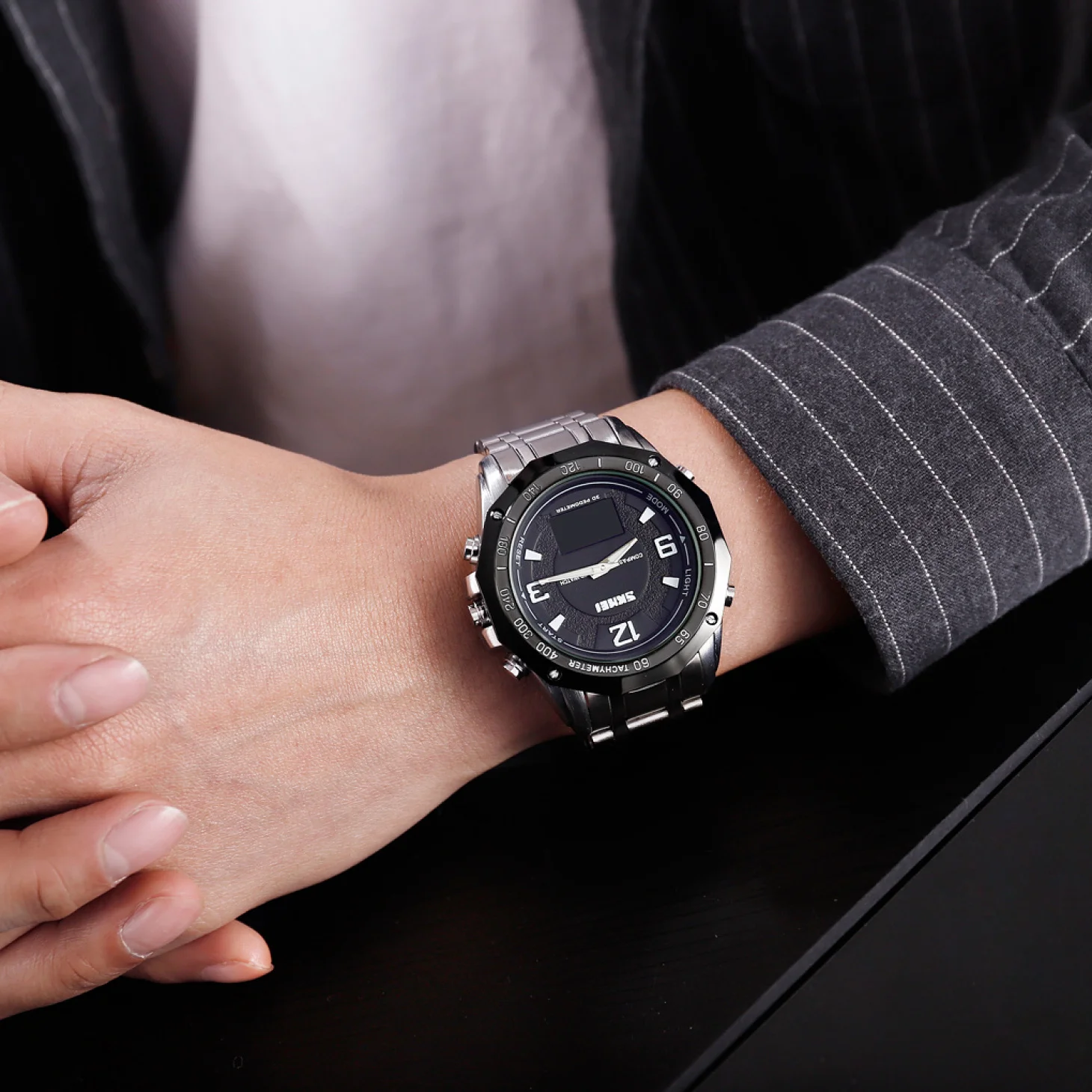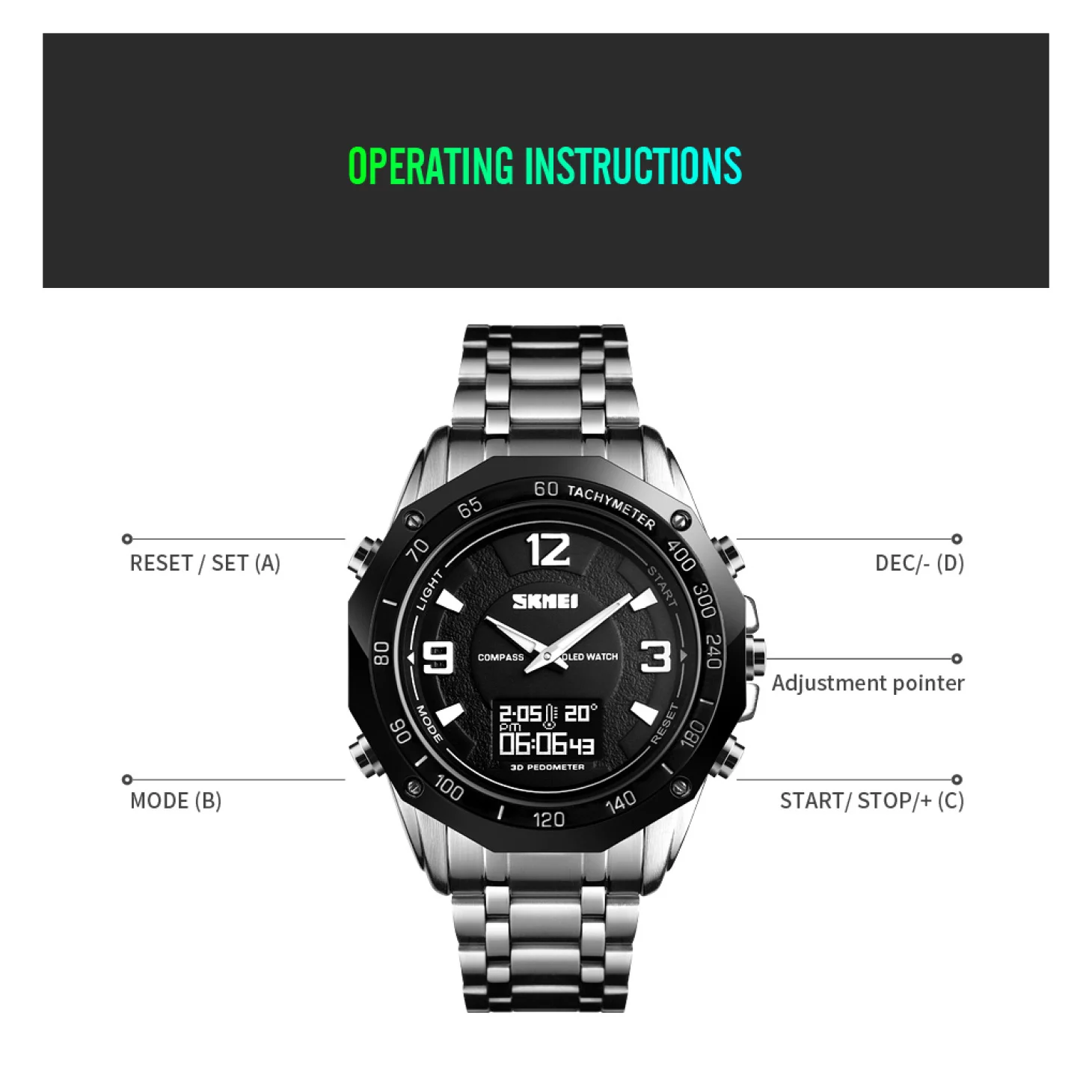 ساعت مچی عقربه‌ای مردانه اسکمی مدل 1464 با طراحی اسپرت و ترکیبی آنالوگ-دیجیتال، مجهز به کرنومتر، آلارم، نور پس‌زمینه و مقاومت 50 متری در برابر آب. مناسب استفاده روزمره و ورزشی با بند استیل ضدزنگ.